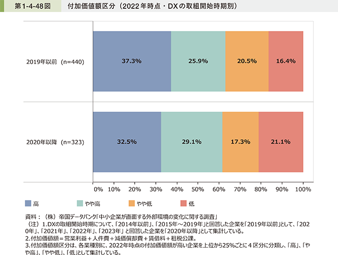 実際に、中小企業白書でも、DXの取組開始が早い企業ほど、付加価値額が高い区分に属する割合が高い傾向が示されています。